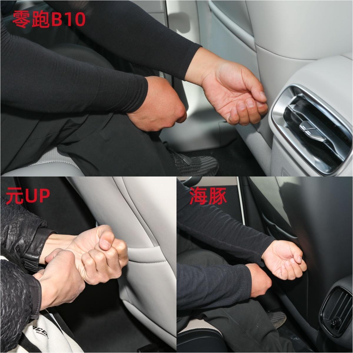 作为一台家用车型,空间和舒适性一定是购车的重点考虑因素,一台车不光要驾驶员开的顺手,还要家人也坐得舒服。三辆车的车身长度虽然比较接近,但实际乘坐体验却各有侧重。前排座椅调整至舒适驾驶位后,零跑B10的第二排腿部空间达到了2拳4指,比元UP的2拳、海豚的2拳1指都要宽裕,后排乘客跷个二郎腿完全不成问题,长途出行也不会觉得憋屈。
