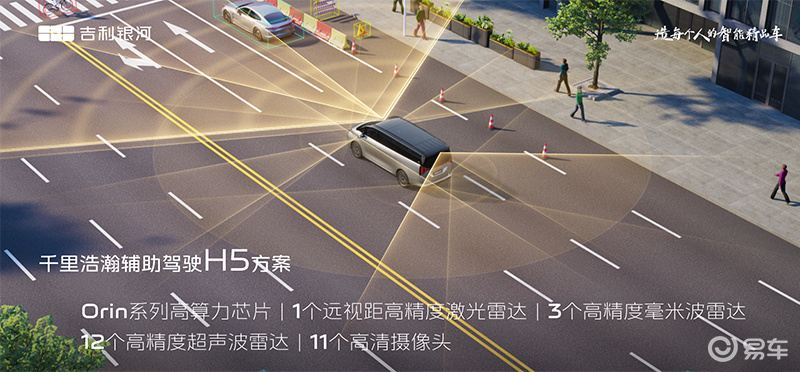 辅助驾驶方面,吉利银河V900搭载了千里浩瀚辅助驾驶H5方案,并采用英伟达Orin系列高算力芯片,提供1个远视距高精度激光雷达、3个高精度毫米波雷达、11个高清摄像头、12个高精度超声波雷达共27个感知单元。车辆支持全国范围内高速NOA、城市NOA。同时,辅助驾驶系统还支持130km/h AES避障、雨天智能控速行车、EMA紧急转向避让辅助、MAI低速误加速抑制、PEB低速紧急制动等功能。
