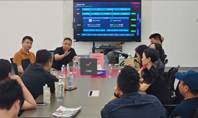在展厅参观结束后,媒体团和元征代表共同参与了交流座谈会。会上, “AI智能维修大模型”成为热议焦点。作为技术代表,产品经理安海月先生以“元征AI――重构汽修服务新生态”为主题,分享了公司对于AI技术的发展蓝图。与此同时,蒋总进一步展示了即将上市的元征新品 “AI OBD”。